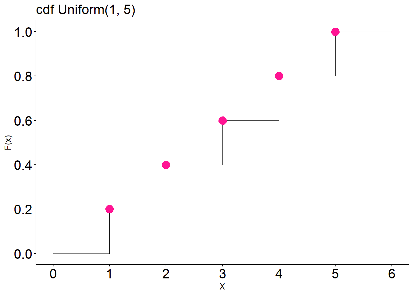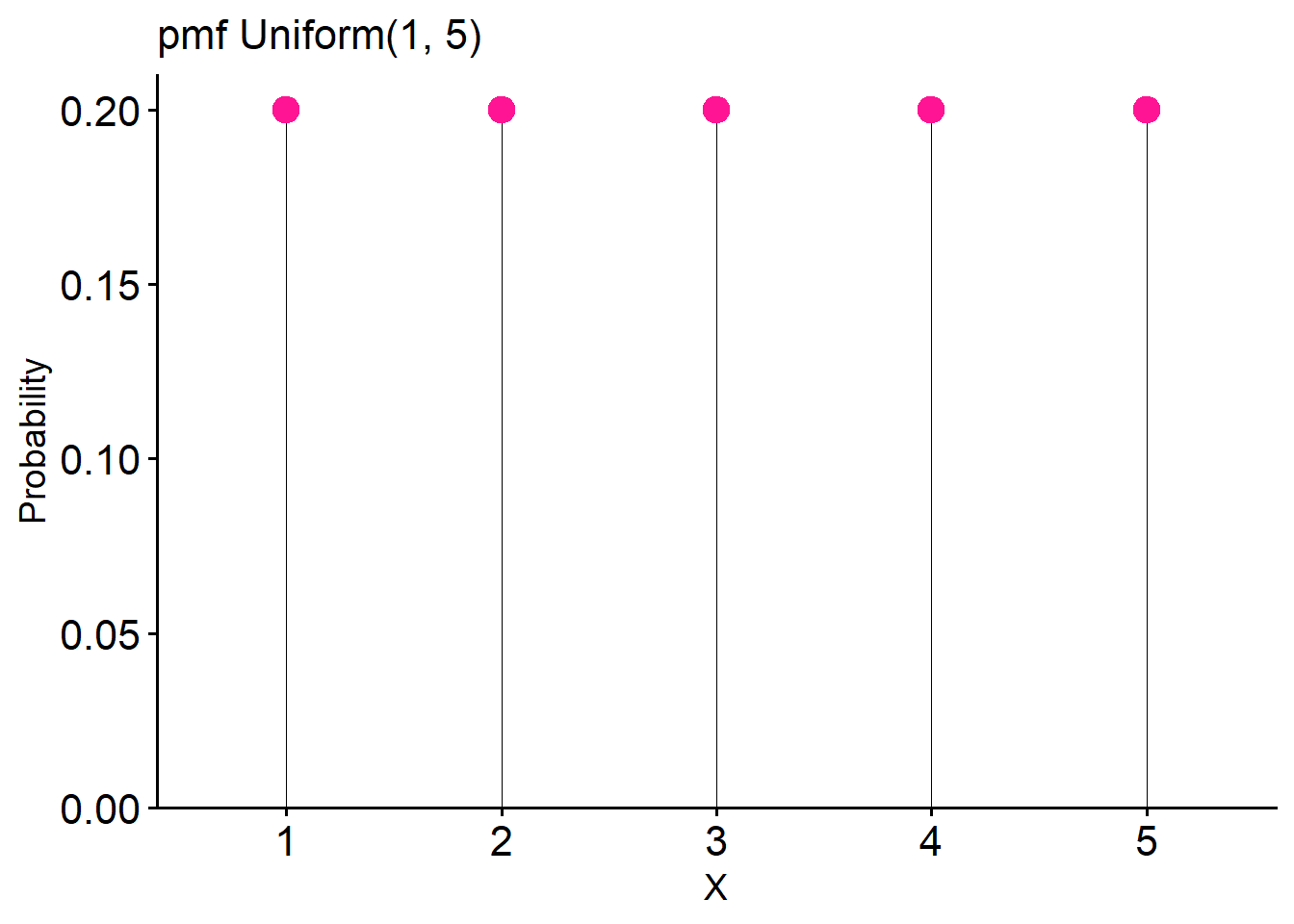 \[P(X = x) = \frac{1}{5-1+1} = \frac{1}{5} = 0.2 \quad \text{where} \quad x \in \left\lbrace 1, 2, 3, 4, 5 \right\rbrace\]