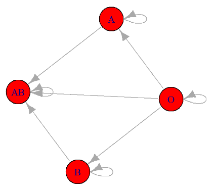 Let the random variable X represent blood type in population, with the following probabilities: P(A) = 0.41, P(B) = 0.10, P(AB) = 0.04, and P(O) = 0.45.