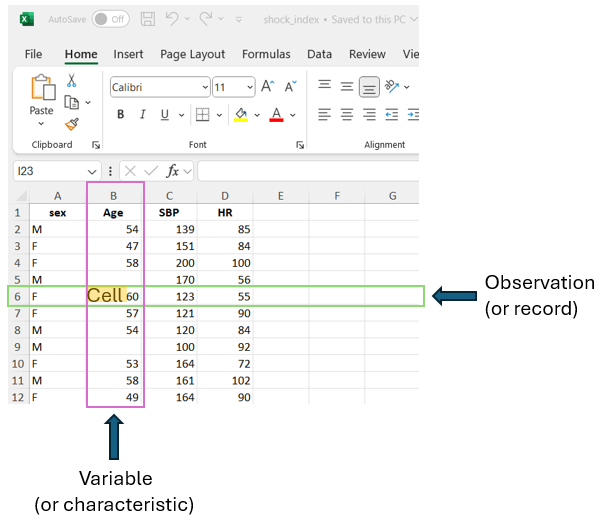 In this textbook, we use structured data in Excel sheets (FIGURE 12.2; see also Chapter 10). This type of data is organized in a tabular format, consisting of rows and columns. Each row represents an observation or record, indicating the statistical unit of the dataset. The columns correspond to the variables or characteristics of interest in the research study. The cells, at the intersection of rows and columns, contain individual data values corresponding to the specific observation and variable.