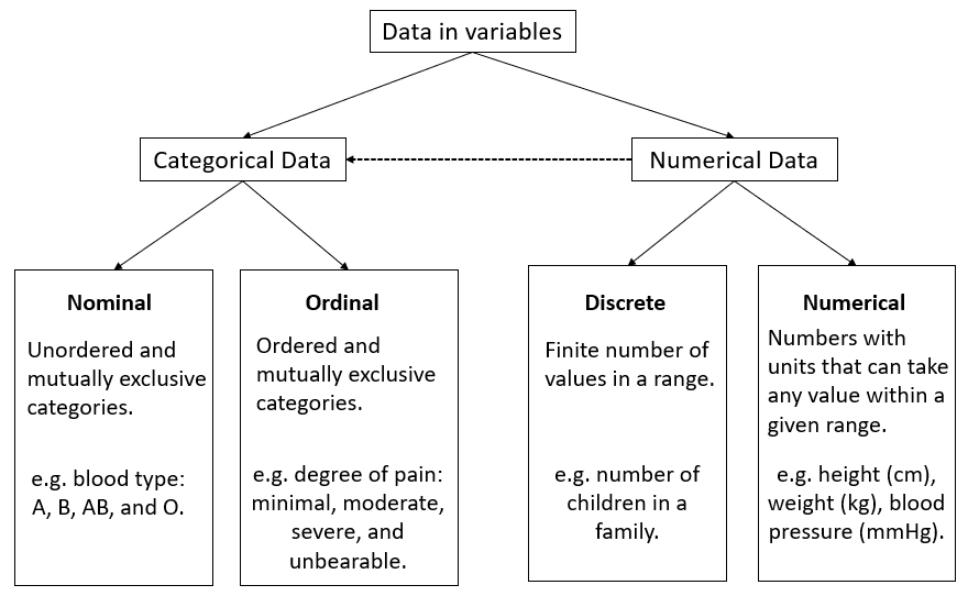 Data in variables can be either categorical or numerical (otherwise known as qualitative and quantitative) in nature (FIGURE 12.3):