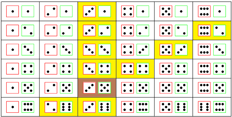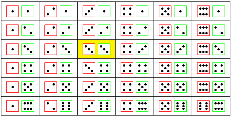 The sample space of the experiment consists of all ordered pairs of numbers from 1 to 6. That is, Ω = {(1, 1), (1, 2), … , (1, 6), (2, 1), … , (6, 6)}. It is useful to define the following two events: