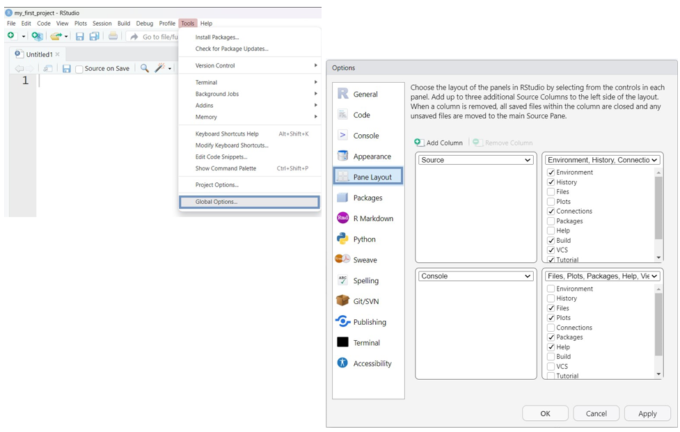 We can change the size of the panes by either clicking the minimize or maximize buttons on the top right of each pane, or by clicking and dragging the middle of the borders of the panes. Additionally, the four panes can be arranged in a different order from that shown in FIGURE 2.11. If desired, we can change where each pane appears within RStudio by adjusting the preferences (FIGURE 2.12). We select from RStudio menu: